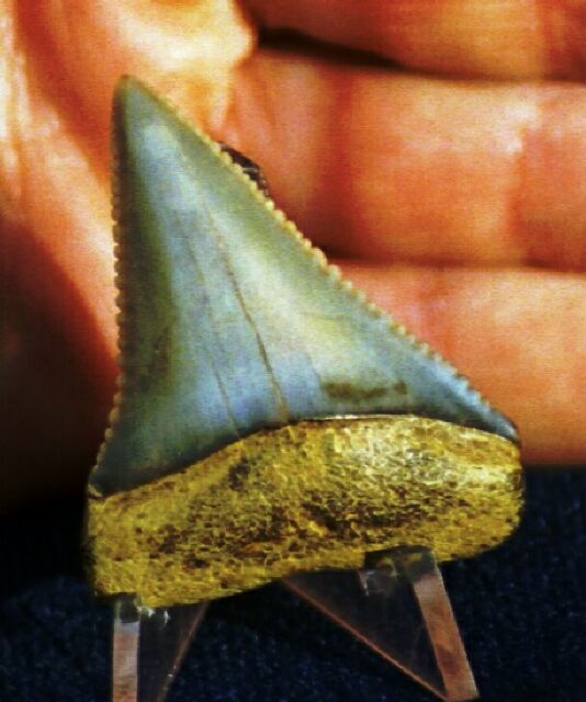 PERUVIAN Moderately serrated, on one side, remnant serrations on the other (I can't figure it out either... but doesn't detract from the beauty of this tooth). This Peruvian tooth looks like it is light blue with "raspberry" highlights around the tip in the front and edges in the back. The shark which gave this tooth up 2 million years ago would be really proud of this one today. | FOR SALE | $49 |