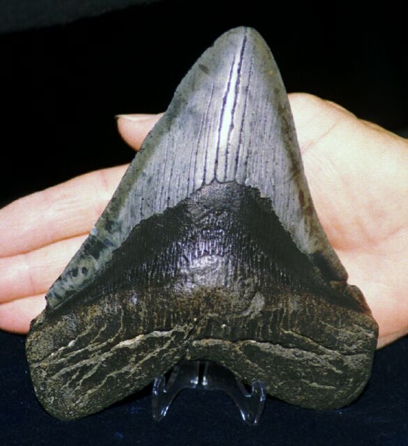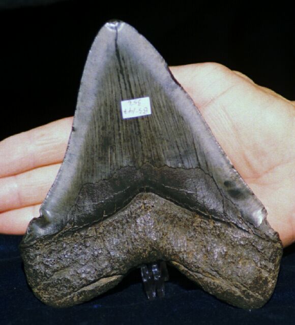 This is one of my largest megalodon teeth. It's just short of the "magic" 6inches and slightly less than 1 pound. It will "fill your hand", is complete, and the root is in exceptional condition for a tooth this size. The enamel is a "steel" blue-grey. The edges of this massive tooth bear whitness to battles with whales and most of the serrations were polished off by rivers during the time horses were losing all but one toe. It is interesting to note that a tooth in this condition only 3/16" longer costs ca. \$1000. | SOLD | $395 |